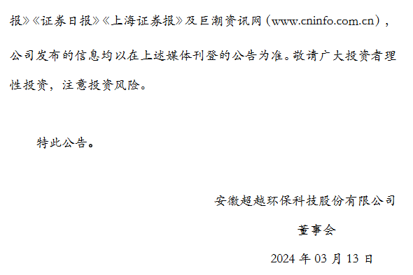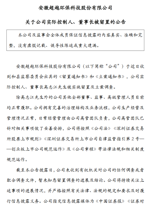 【谷騰環保網訊】獲悉,3月12日晚間,超越科技公告稱,公司實際控制人、董事長高志江被實施留置及立案調查。除高志江外的公司其他全部董事、監事、高級管理人員目前均正常履職。截至目前,公司未收到有權機關對公司的任何調查或者配合調查文件,暫未知悉留置調查的進展及結論。