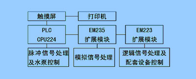 自控(kong)系統(tong)分為(wei)兩級:上位(wei)(wei)監(jian)視級和(he)下位(wei)(wei)控(kong)制(zhi)(zhi)級,如圖2所示。監(jian)視級由(you)一(yi)臺日(ri)本(ben)Hakko公司的V606i型觸(chu)(chu)摸(mo)(mo)(mo)屏和(he)一(yi)臺打(da)印機組成,實現現場(chang)工作狀態的同(tong)步監(jian)視,并可隨時打(da)印現場(chang)的運行(xing)數(shu)據(ju)。控(kong)制(zhi)(zhi)級由(you)一(yi)臺S7-200 CPU224 型可編程邏輯控(kong)制(zhi)(zhi)器(PLC)及(ji)一(yi)個(ge)模擬量(liang)采集(ji)模塊EM 235、一(yi)個(ge)I/O擴展模塊EM 223和(he)觸(chu)(chu)摸(mo)(mo)(mo)屏組成。其(qi)中,PLC用(yong)于流(liu)量(liang)采集(ji)、1#、3#計量(liang)泵的輸(shu)出(chu)信(xin)號處(chu)理和(he)反洗(xi)水(shui)泵、攪拌泵、空壓機、抽水(shui)泵的控(kong)制(zhi)(zhi);EM 235用(yong)于PH計的信(xin)號輸(shu)入和(he)2#計量(liang)泵的輸(shu)出(chu)信(xin)號處(chu)理;EM223用(yong)于水(shui)位(wei)(wei)信(xin)號采集(ji)和(he)漩流(liu)分離器、撞擊流(liu)裝置(zhi)的控(kong)制(zhi)(zhi);觸(chu)(chu)摸(mo)(mo)(mo)屏除了提供監(jian)視功能,也具有控(kong)制(zhi)(zhi)功能,可通(tong)過它設(she)定參數(shu)及(ji)實現對每個(ge)系統(tong)設(she)備的單獨(du)控(kong)制(zhi)(zhi)。觸(chu)(chu)摸(mo)(mo)(mo)屏和(he)PLC之間通(tong)過RS-442/485轉(zhuan)換線(xian)通(tong)信(xin)。
