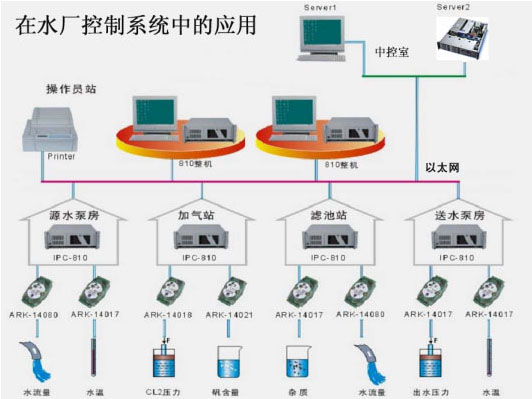 系統的(de)(de)網絡(luo)結構設計則(ze)采用RS-485工業總(zong)(zong)線(xian)和(he)Ethernet(TCP/IP)組合形式,系統將(jiang)現場的(de)(de)信號,包括水(shui)流量(liang)、水(shui)溫、雜質(zhi)含量(liang)、水(shui)壓力(li)等參數(shu),通(tong)過(guo)相(xiang)(xiang)應(ying)(ying)(ying)的(de)(de)傳感(gan)器(qi)(qi)的(de)(de)數(shu)據采集(ji),用研祥公司的(de)(de)基于(yu)RS-485總(zong)(zong)線(xian)的(de)(de)數(shu)據采集(ji)與控制(zhi)(zhi)(zhi)模塊(kuai),將(jiang)傳感(gan)器(qi)(qi)的(de)(de)數(shu)據進行采集(ji),送入到(dao)泵(beng)房的(de)(de)控制(zhi)(zhi)(zhi)工控機(ji)中(zhong),并運(yun)(yun)用相(xiang)(xiang)應(ying)(ying)(ying)的(de)(de)組態軟件進行數(shu)據處(chu)理(li),再送到(dao)操作員控制(zhi)(zhi)(zhi)室,可以在中(zhong)控室進行數(shu)據瀏覽和(he)監控。同時,如果需(xu)要進行相(xiang)(xiang)應(ying)(ying)(ying)的(de)(de)控制(zhi)(zhi)(zhi),則(ze)是通(tong)過(guo)網絡(luo)向各個泵(beng)房的(de)(de)工控機(ji)發(fa)出相(xiang)(xiang)應(ying)(ying)(ying)的(de)(de)指令,運(yun)(yun)用各個模塊(kuai)的(de)(de)控制(zhi)(zhi)(zhi)功(gong)能,實現各個泵(beng)房的(de)(de)控制(zhi)(zhi)(zhi)。于(yu)是實現各個泵(beng)房的(de)(de)無(wu)人值守,穩定(ding)可靠工作。