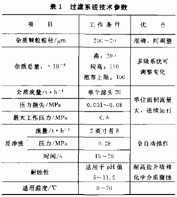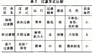 表2為盤片過濾與常用兩種過濾方式的簡單比較,應用時可根據來水及出水水質要求,確定經濟臺理的過濾方式,然后進行設備選型。