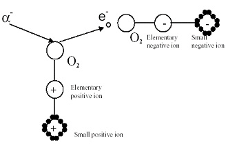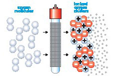OT(離子除臭方法)實際上是化學法的一種,其工作原理是指在常溫下,空氣通過高能離子發生裝置時,α顆粒撞擊中性的氧分子,使中性分子失去電子變成正極基本離子,而釋放的電子在瞬間與另一中性分子結合,形成負極基本離子。基本離子的兩極分化,發射出的高能量電子碰撞而形成分別帶有正、負電荷的氧離子(原理見下圖),并且各吸附10-20個分子形成離子群。因氧化氫、·OOH的催化作用,并且產生 O2、O2-、O2+、•OH、•HO2、•O、O等氧簇聚集體,具有極強的氧化能 力,因此我們稱其為“活性氧”。活性氧的氧化能力是氧氣的1000倍,我們把這些高能活性的氧離子稱為高能活性氧。