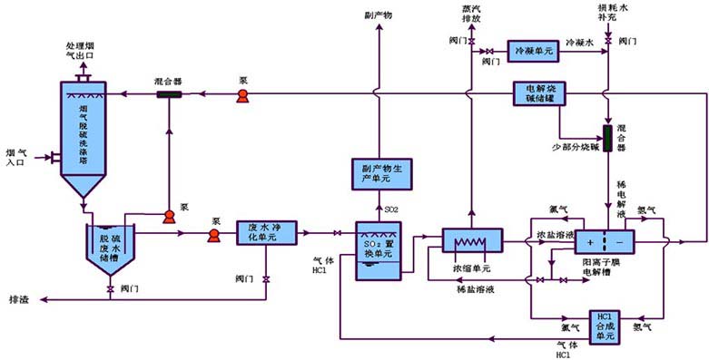 該工藝的特點是不用外購原料食鹽制堿,利用工藝中產生的鹽酸進行酸解二氧化硫,達到循環再生脫硫劑的目的。但由于系統中沒有了氯氣和氫氣的副產品,經濟效益比氯堿/硫酸鈉法遜色,但在液氯銷售有困難的地區,本技術有其獨特的發展空間。