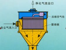 含塵氣流經風道進入中部箱體(塵氣箱),當含塵氣體由塑燒板的外表面通過塑燒板時,粉塵被阻留在塑燒板外表面的PTFE涂層上,潔凈氣流透過塑燒板外表面經塑燒板內腔進入凈氣箱,并經排風管道排出。隨著塑燒板外表面粉塵的增加,電子脈沖控制儀可按定阻或定時控制方式,自動選擇需要清理的塑燒板,觸發打開噴吹閥,將壓縮空氣噴入燒結板內腔中,反吹掉聚集在塑燒板外表面的粉塵,粉塵在氣流及重力作用下落入料斗。