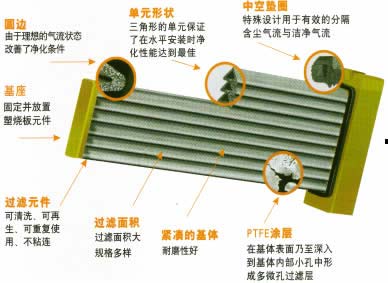 塑燒板過濾元件呈剛性波浪式多孔結構,是由多種高分子化合物粉體及特殊的結合劑嚴格配比后進行鑄型燒結,形成一個波浪式多孔母體作為燒結板過濾元件的基板,基板厚約4mm,其內部形成大約30微米的均勻孔隙,然后通過特殊的噴涂工藝在母體表面的空隙里填充PTFE涂層,形成1~2微米左右的孔隙。