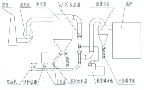 我公司開發的半干式循環法煙氣凈化系列之垃圾焚燒煙氣處理裝置是針對垃圾焚燒煙氣中的有毒有害成分而專門設計的活性碳循環法,它是在管道式WX反應器內利用活性炭(焦)的超大微孔表面積來吸附凈化煙氣中的各種重金屬、二惡英類等有害物質;利用氨水與煙氣中的SO2、HCl、HF、NOx等酸性廢氣進行吸收化學反應;用此二種反應的共同作用達到廢氣處理的一種方法。