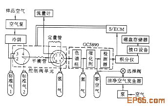 該系(xi)統(tong)主要包(bao)括:裝配有FID和HP19205A鎳催化(hua)劑管(guan)的HP5890(Ⅱ)型(xing)氣(qi)相(xiang)色(se)譜儀(yi);HP3396Ⅱ型(xing)積分儀(yi)及HP樣(yang)品/外部(bu)事(shi)件控(kong)制器(S/ECM);帶有HP82169C HP-IL/HP-IB接(jie)口的HP9122C型(xing)磁(ci)盤驅動(dong)器;用HP19238E閥(fa)加熱器保(bao)持恒溫的4路選(xuan)擇閥(fa)和6口進樣(yang)閥(fa);保(bao)存于高(gao)壓鋁瓶和鋼瓶內的兩(liang)個(ge)標準氣(qi)、高(gao)純(chun)氮氣(qi)、高(gao)純(chun)氫(qing)氣(qi);合成(cheng)空氣(qi)發生器.圖(tu)1是系(xi)統(tong)工作流程的示意圖(tu).