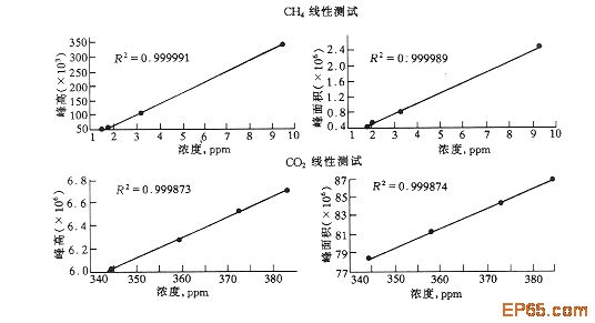 測定系統(tong)對(dui)(dui)CH4的(de)(de)(de)(de)(de)線(xian)性,使用(yong)了(le)4個(ge)(ge)不(bu)(bu)同已(yi)知(zhi)(zhi)(zhi)濃度(du)的(de)(de)(de)(de)(de)標準(zhun)氣(qi)(CH4 1.7249ppm,1.9686ppm,3.0472ppm,9.79ppm),用(yong)第一個(ge)(ge)標準(zhun)氣(qi)進(jin)(jin)樣的(de)(de)(de)(de)(de)峰(feng)高(gao)和(he)峰(feng)面積分別計(ji)算后3個(ge)(ge)標準(zhun)氣(qi)進(jin)(jin)樣的(de)(de)(de)(de)(de)CH4混合(he)比(bi)率濃度(du),得到(dao)測定值與真實值的(de)(de)(de)(de)(de)絕(jue)對(dui)(dui)差(cha)約(yue)為(wei)1ppb;對(dui)(dui)CO2,也使用(yong)4個(ge)(ge)不(bu)(bu)同已(yi)知(zhi)(zhi)(zhi)濃度(du)的(de)(de)(de)(de)(de)標準(zhun)氣(qi)(CO2 344.477ppm,358.722ppm,372.045ppm,383.835ppm),得其絕(jue)對(dui)(dui)差(cha)約(yue)為(wei)0.2ppm.線(xian)性測試的(de)(de)(de)(de)(de)結(jie)果見圖2.由圖可知(zhi)(zhi)(zhi),用(yong)峰(feng)高(gao)計(ji)算的(de)(de)(de)(de)(de)CH4和(he)CO2濃度(du)準(zhun)確性較好,該GC-FID系統(tong)使用(yong)單點(dian)標準(zhun)近似法計(ji)算樣品氣(qi)的(de)(de)(de)(de)(de)混合(he)比(bi)率濃度(du),對(dui)(dui)CH4和(he)CO2都是有效的(de)(de)(de)(de)(de)(對(dui)(dui)CH4僅適(shi)用(yong)于3ppm的(de)(de)(de)(de)(de)濃度(du)變化范圍).
