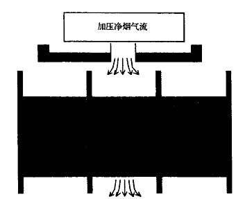 根(gen)據公式(2),GGH選型確定后,其轉(zhuan)速R與轉(zhuan)子(zi)倉(cang)格(ge)(ge)的(de)(de)容積V即為定值,無法通(tong)過改(gai)變其參數(shu)而達(da)到減(jian)小攜帶泄漏量的(de)(de)目的(de)(de),但我們(men)可以在(zai)密(mi)封區增加一些密(mi)封手段。根(gen)據轉(zhuan)子(zi)轉(zhuan)向,在(zai)上游密(mi)封區布置(zhi)(zhi)1套凈(jing)化系統(tong),由1臺風機、煙(yan)(yan)(yan)(yan)氣(qi)(qi)管(guan)道和相(xiang)關擋板組成,從GGH 凈(jing)煙(yan)(yan)(yan)(yan)氣(qi)(qi)側(ce)(ce)的(de)(de)出(chu)口處(chu)抽(chou)取一定量的(de)(de)具有一定壓(ya)力(li)的(de)(de)凈(jing)煙(yan)(yan)(yan)(yan)氣(qi)(qi),噴人(ren)密(mi)封區的(de)(de)轉(zhuan)子(zi)內來置(zhi)(zhi)換(huan)轉(zhuan)子(zi)內的(de)(de)原(yuan)煙(yan)(yan)(yan)(yan)氣(qi)(qi),從而達(da)到減(jian)少攜帶原(yuan)煙(yan)(yan)(yan)(yan)氣(qi)(qi)的(de)(de)目的(de)(de)(見圖2)。凈(jing)化裝置(zhi)(zhi)通(tong)過布置(zhi)(zhi)在(zai)熱端中(zhong)間梁上原(yuan)煙(yan)(yan)(yan)(yan)氣(qi)(qi)側(ce)(ce)(原(yuan)煙(yan)(yan)(yan)(yan)氣(qi)(qi)側(ce)(ce)轉(zhuan)向凈(jing)煙(yan)(yan)(yan)(yan)氣(qi)(qi)側(ce)(ce)處(chu))的(de)(de)一條布滿整個扇形板長度的(de)(de)長槽中(zhong)噴出(chu)凈(jing)煙(yan)(yan)(yan)(yan)氣(qi)(qi),使經過該處(chu)的(de)(de)轉(zhuan)子(zi)倉(cang)格(ge)(ge)中(zhong)的(de)(de)大部分原(yuan)煙(yan)(yan)(yan)(yan)氣(qi)(qi)和灰(hui)粒在(zai)轉(zhuan)子(zi)轉(zhuan)入凈(jing)煙(yan)(yan)(yan)(yan)氣(qi)(qi)側(ce)(ce)前被凈(jing)煙(yan)(yan)(yan)(yan)氣(qi)(qi)置(zhi)(zhi)換(huan)掉,使轉(zhuan)子(zi)倉(cang)格(ge)(ge)攜帶到凈(jing)煙(yan)(yan)(yan)(yan)氣(qi)(qi)側(ce)(ce)的(de)(de)原(yuan)煙(yan)(yan)(yan)(yan)氣(qi)(qi)和灰(hui)粒降(jiang)至最少。