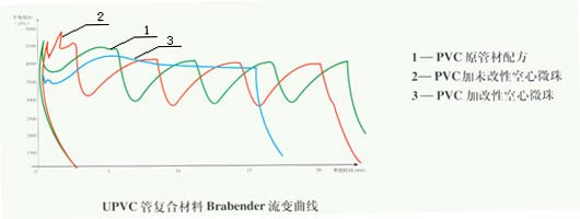 ● 空心微珠加入到UPVC管的試驗結果表明,空心微珠可以明顯改善PVC硬管的加工流動性能,顯著縮短塑化時間,降低最大扭矩。其流變曲線見下圖。
