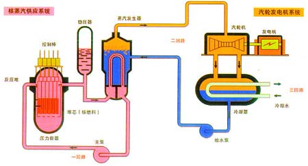 核電站與火電廠主要的不同是蒸汽供給系統。火電廠是利用燃燒化石燃料(煤、石油、天然氣)直接將鍋爐里水變成高溫蒸氣;核電站是利用反應堆中核燃料(鈾-235)裂變反應釋放的大量熱能,用處于高壓力下的水把熱能帶出,在蒸汽發生器內產生蒸汽。其中反應堆就是一種特殊的鍋爐,有人也稱它為原子能反應爐。