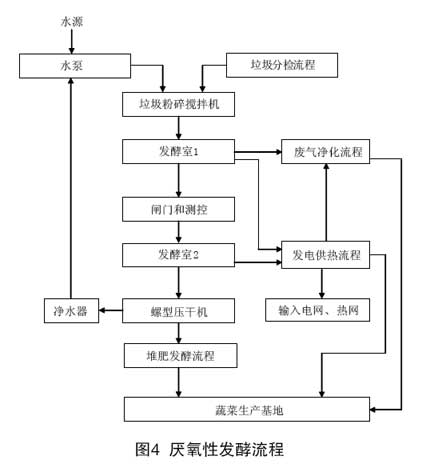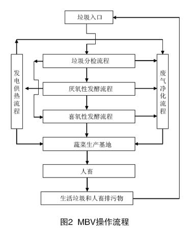 MBV操作流程由垃圾分檢流程、厭氧性發酵流程、喜氧性發酵流程、發電供熱流程、廢氣凈化流程5個子流程組成。操作流程見圖2。