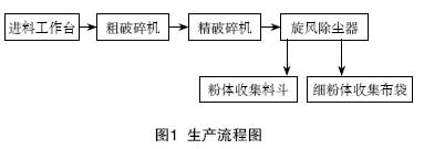 該系統的主要(yao)設(she)備為:進料(liao)工作臺、粗破碎(sui)機、精破碎(sui)機、旋(xuan)風除塵器、粉體收集(ji)(ji)料(liao)斗、細(xi)粉體收集(ji)(ji)布(bu)袋、風機等。生(sheng)產流程見圖1: