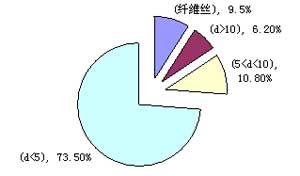 粗破(po)碎產物中(zhong)除了細、中(zhong)、大(da)顆(ke)粒物之(zhi)外,一般(ban)還含有纖維絲(si)(si),纖維絲(si)(si)為物料的表皮。以秸稈為例,秸稈纖維絲(si)(si)平(ping)均長(chang)40mm,圖(tu)2是纖維絲(si)(si)及各(ge)種(zhong)粒徑(jing)的顆(ke)粒物所占總量(liang)百分比的分布圖(tu)。