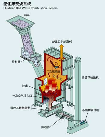 流化床焚燒爐是在爐內鋪設一定厚度,一定粒度范圍的石英砂,通過底部布風板鼓入一定壓力的空氣,將砂粒吹起類似水的沸騰狀態。流化床內氣固混合強烈,傳熱傳質速率高,單位面積處理能力大,具有極好的著火條件。垃圾入爐后即和熾熱的石英砂迅速處于完全混合狀態,垃圾受到充分加熱、干燥,有利于完全燃燒。流化床爐采用石英砂作為熱載體,蓄熱量大,燃燒穩定性較好,燃燒反應溫度均勻,很少局部過熱。流化床焚燒爐能處理生活垃圾、工業廢物和污泥等廣泛的廢物種類。
