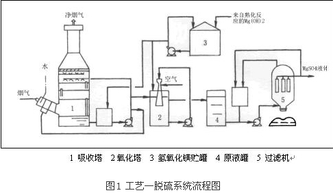 氧化鎂法煙氣脫硫工藝具有投資少、吸收劑用量少、占地面積相對較小、脫硫效率高等特點,脫硫效率可達95%以上。氧化鎂法煙氣脫硫工藝按最終反應產物可分為兩種:其一產物為硫酸鎂:原理是氧化鎂進行熟化反應生成氫氧化鎂,制成一定濃度的氫氧化鎂吸收漿液。在吸收塔內氫氧化鎂與煙氣中的二氧化硫反應生成亞硫酸鎂。亞硫酸鎂經強制氧化生成硫酸鎂,分離干燥后生成固體硫酸鎂。另一種工藝為氧化鎂再生法,即在吸收塔內氫氧化鎂與煙氣中的二氧化硫反應生成亞硫酸鎂的過程中抑制亞硫酸鎂氧化,不使亞硫酸鎂氧化生成硫酸鎂。亞硫酸鎂經分離、干燥、焙燒,最后還原成氧化鎂和一定濃度的二氧化硫富氣,還原后氧化鎂返回系統重復利用,二氧化硫富氣被用來制造硫酸。焙燒亞硫酸鎂需要對溫度進行控制。工藝二系統相當復雜,投資費用高。目前的鎂法脫硫多采用生成硫酸鎂為最終產物。