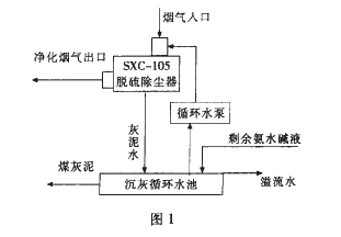 鍋爐煙氣經煙道進入脫硫除塵器處理后, 經引風機進入煙囪排放, 而堿水經噴淋、漩流、脫水后通過脫硫除塵器溢流口流出, 經灰溝流入沉淀池,再進入循環水池, 澄清的堿水經循環水泵輸送至脫硫除塵器噴淋裝置, 形成閉路循環。需根據 pH 值補加剩余氨水堿液, 使其保持在 pH8~10 之間。沉淀池及循環水池沉降下來的煙灰定期人工清理, 與爐渣一起出售制磚。