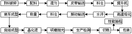 各(ge)種原輔(fu)材料(liao)按(an)比例配合混勻(yun)后(hou)(hou)(hou),送入(ru)(ru)窯頭料(liao)倉;然后(hou)(hou)(hou)把混勻(yun)原料(liao)送進(jin)熔(rong)窯進(jin)行高溫(wen)熔(rong)化(hua),澄(cheng)清后(hou)(hou)(hou)經過流(liu)液道流(liu)入(ru)(ru)料(liao)池,流(liu)下時用(yong)加壓水(shui)槍沖水(shui)急冷(leng),使(shi)玻璃(li)體(ti)水(shui)淬成6mm以下的顆粒后(hou)(hou)(hou)脫水(shui)排(pai)升(sheng)(sheng),再靠自身(shen)溫(wen)度烘(hong)干,過篩后(hou)(hou)(hou)提升(sheng)(sheng)至熟料(liao)倉備用(yong)。再將玻璃(li)晶(jing)體(ti)按(an)各(ge)種規格(ge)裝車(che)成型(xing),推入(ru)(ru)晶(jing)化(hua)退(tui)火爐中(zhong)高溫(wen)成型(xing)晶(jing)化(hua)退(tui)火;然后(hou)(hou)(hou)對成型(xing)晶(jing)化(hua)的產(chan)品(pin)進(jin)行磨、拋、切(qie)裁、形成成品(pin)。