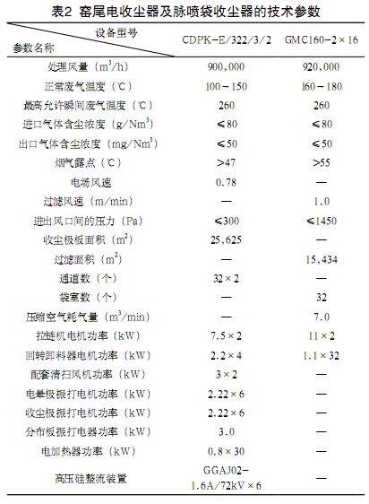根據窯尾煙氣參數和《水泥工業大氣污染物排放標準》(GB4915-2004)并考慮濾袋實際使用壽命及經濟性,電收塵器設備選型為CDPK-E/322/3/2,在線脈噴袋收塵器設備選型為GMC160-2×16,設備參數見表2。