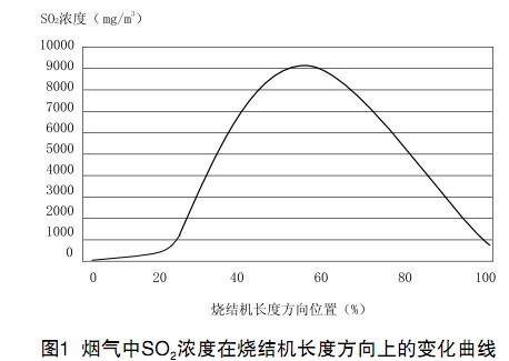 燒結煙氣中SO2的S主要來自鐵礦粉和煤粉中的硫化物和硫酸鹽,通過燒結,原料中90%以上的硫可以脫除,形成氣體排出。在燒結機各風箱內,煙氣中SO2濃度各不相同,差異很大(見圖1)。從圖1中可見,低濃度的煙氣量約占全部煙氣量的 1/2。如果將全部煙氣進行脫硫,不僅投資大,脫硫效率低,而且脫硫運行成本也高。因此,不管采取何種脫硫工藝,只要把中間高SO2濃度段的煙氣匯集到一條獨立的脫硫煙道內有選擇地進行脫硫,就可以實現低投資、低成本地高效脫硫。