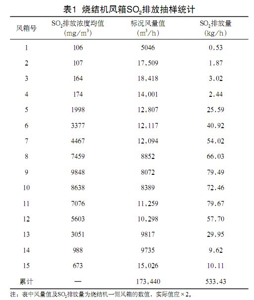 為確定所需脫硫的煙氣所在風箱位置及數目,對燒結機的15個風箱中的煙氣進行SO2的現場檢測,平均數值見表1。