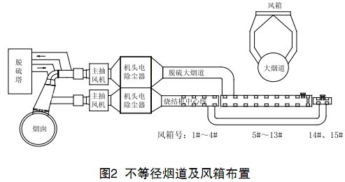 為實現選擇性脫硫的目的,技術人員設計出了分段式不等徑煙道布置方案(見圖2),即把常規設計的一條煙道分成直徑不同的3段,頭、尾不需脫硫的煙道匯集成1條,中間脫硫段獨立1條煙道。2條煙道各自對應配置了大小不同的2臺(套)電除塵器和主抽風機(2套除塵器的總除塵面積、主抽風機電機總功率和常規1條煙道的燒結機是一樣的)。為適應脫硫需要,在脫硫煙道尾部增設溫度自動補償裝置,穩定脫硫煙氣的溫度。這種布置保證了燒結機兩邊風箱接入煙道的路徑完全相同,不會引起風量不平衡的現象,既可滿足脫硫需要,又不影響燒結,而且布置簡單。