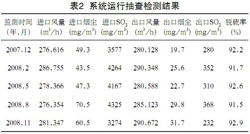 福建三鋼180m2 燒結機脫硫設施自2007年運行至今,系統總體運行穩定,基本上實現了工藝實施前提出的脫硫效率、系統同機運轉率在90%以上及脫硫后粉塵濃度低于50mg/m3 的目標,并已實現了與省、市環境監測站在線監測的并網。三明市環境監測站對該系統的抽查檢測結果見表2。
