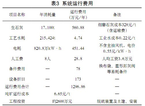 循環流化床半干法脫硫以細磨生石灰粉為脫硫劑,資源充足,脫硫設施簡單,運行成本較低。特別是采用選擇性脫硫方法,使得運行成本又可以降低35%左右。系統運行費用見表3。