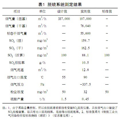 以邢鋼燒結廠為例。該廠新上198m2 燒結機一臺,并在機頭及機尾分別設置了電除塵器,由于在燒結過程中產生的煙氣中的SO2濃度是變化的,其頭部和尾部煙氣SO2濃度較低,中后部煙氣SO2濃度高。為減小脫硫裝置的規模,故將機頭電除塵器的出口接至脫硫裝置。由于邢鋼焦化廠距離燒結廠僅約200米,而且焦化廠的副產品廢氨水此前是通過硫酸進行中和處理的。如將這部分廢氨水引入燒結脫硫,既可解決邢鋼燒結廠的燒結脫硫問題,也可解決焦化廠的廢氨水處理問題,同時產出的硫酸氨還有經濟收益。因此,該項目選擇了氨-硫銨法處理燒結煙氣脫硫。
