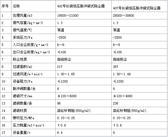 清(qing)灰力度小,內阻大是導致(zhi)扁袋除塵(chen)(chen)器(qi)不能(neng)(neng)滿足使用要(yao)求的主(zhu)要(yao)原因,由于各(ge)轉(zhuan)運站之間距離太遠,只能(neng)(neng)選(xuan)(xuan)用獨立的除塵(chen)(chen)系統。為此,根(gen)據燒結粉塵(chen)(chen)的特性及現場實際情況,選(xuan)(xuan)用了長(chang)袋低壓脈沖這(zhe)種(zhong)新型(xing)袋式除塵(chen)(chen)器(qi),分(fen)別對402號(hao)和407號(hao)轉(zhuan)運站的塵(chen)(chen)源進行治(zhi)理。除塵(chen)(chen)設(she)備主(zhu)要(yao)技(ji)術(shu)性能(neng)(neng)參數見(jian)表3。