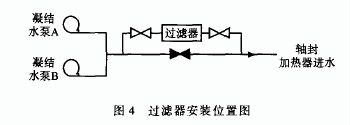 選用PALL公司的過濾器:32HFHS.6GDAH25.CHP0018,壓力等級3MPa,水壓試驗3.75MPa,流量800t/h,最大流量960t/h,濾芯數量32支,濾芯長度1500mm,允許介質溫度≤65℃,初始壓差2kPa,差壓達到150kPa時更換濾芯,最大允許壓差350kPa,過濾器進出口通徑3001‘111‘1‘1。殼體、管板、濾芯骨架材質采用304不銹鋼,殼體長度3.8m,直徑1.31"1‘1。該過濾器能夠安裝在凝結水泵出口與軸封加熱器之間。2號機組2004年中修時就安裝了該過濾器。