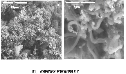 研究方法采用離線操作方式進(jin)行,先(xian)將(jiang)環境(jing)水樣(yang)過柱吸附,然后(hou)洗滌、洗脫(tuo)(tuo),再將(jiang)甲(jia)醇或(huo)乙腈洗脫(tuo)(tuo)液注射(she)進(jin)樣(yang)進(jin)行高效液相色譜測定(ding)。固相萃(cui)取使用的多壁碳納(na)米(mi)管的外(wai)徑(jing)為30到(dao)60 nm之間,比表面積為131.74 m2/g。該碳納(na)米(mi)管的高放大掃描電鏡照片如圖1所示(shi)。