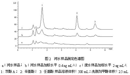 將該萃取方(fang)法(fa)(fa)與高(gao)效液(ye)相色譜(pu)結(jie)合,實現了對(dui)一些(xie)環境水(shui)樣如自來水(shui)、河水(shui)、海水(shui)和廢水(shui)等中的這些(xie)物(wu)(wu)質(zhi)的分析,方(fang)法(fa)(fa)的檢(jian)測限對(dui)雙酚(fen)A、4-壬基酚(fen)、4-辛基酚(fen)、酞(tai)酸(suan)二乙酯(zhi)(zhi)、酞(tai)酸(suan)二正丙(bing)酯(zhi)(zhi)、酞(tai)酸(suan)二異丁酯(zhi)(zhi)和酞(tai)酸(suan)二環己酯(zhi)(zhi)等物(wu)(wu)質(zhi)分別(bie)為0.083、 0.024、 0.018、0.18、0.23、0.48和0.86 ng mL-1。圖2是本(ben)方(fang)法(fa)(fa)富集后(hou)液(ye)相色譜(pu)測定所得色譜(pu)圖。