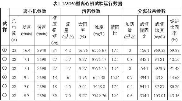 2008年10月底,公司選用上海(hai)離(li)心(xin)機(ji)(ji)械研究所的(de)車載LW350型(xing)(xing)臥(wo)螺(luo)離(li)心(xin)機(ji)(ji)對循環(huan)水污泥進(jin)行了定性試驗(yan),LW350型(xing)(xing)離(li)心(xin)機(ji)(ji)的(de)主(zhu)要參數(shu)為:螺(luo)旋(xuan)差速(su)2~20r/min、轉(zhuan)鼓轉(zhuan)速(su)3700r/min、電(dian)機(ji)(ji)功率15kW。絮凝劑選用濃度為1.5‰的(de)陰離(li)子型(xing)(xing)聚丙(bing)烯酰(xian)胺(an),試驗(yan)數(shu)據見表1。
