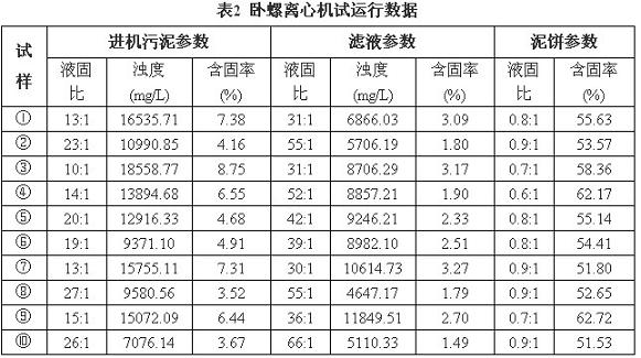 試運行(xing)期間,進(jin)機(ji)(ji)污(wu)泥參數(shu)變(bian)化不大,離心機(ji)(ji)各(ge)項參數(shu)基(ji)本保持為:污(wu)泥流量20m3/h、差速8r/min、轉速1800r/min、主機(ji)(ji)電流30A。試運行(xing)數(shu)據見(jian)表2。