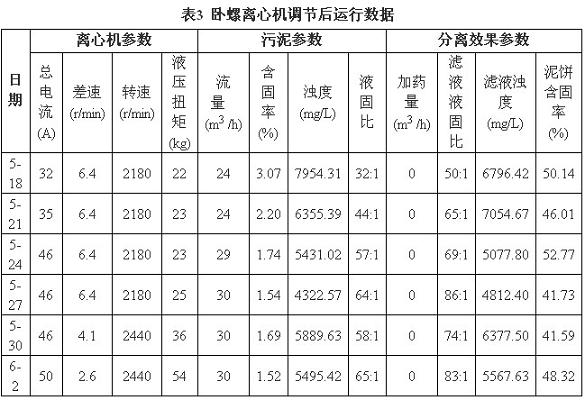 在(zai)(zai)參(can)數的(de)(de)摸(mo)索(suo)調節中(zhong),轉(zhuan)(zhuan)鼓轉(zhuan)(zhuan)速(su)(su)過大(da)會造成離心機(ji)本體(ti)(ti)的(de)(de)磨損和增(zeng)加(jia)動力消(xiao)耗,轉(zhuan)(zhuan)速(su)(su)過小,達不到(dao)處理效果,在(zai)(zai)前(qian)期(qi)運行(xing)轉(zhuan)(zhuan)速(su)(su)1800r/min的(de)(de)情(qing)況(kuang)下,適當調節到(dao)2100~2500r/min范(fan)圍(wei)內(nei);同時結合污泥含固(gu)率的(de)(de)減少和物(wu)料的(de)(de)難(nan)分(fen)離特性(xing),將差速(su)(su)由前(qian)期(qi)的(de)(de)8r/min降低(di)到(dao)2.5~6r/min范(fan)圍(wei)內(nei),延(yan)長(chang)固(gu)體(ti)(ti)顆粒在(zai)(zai)離心機(ji)內(nei)的(de)(de)停留時間。調節后運行(xing)數據見表3(選擇上午(wu)8時數據)。