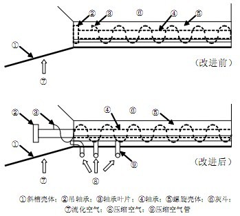 在(zai)(zai)實際脫硫工程中,對(dui)除塵器底部(bu)螺旋(xuan)輸(shu)(shu)送(song)(song)機(ji)進(jin)(jin)行(xing)了改進(jin)(jin)(如圖3)。螺旋(xuan)輸(shu)(shu)送(song)(song)機(ji)的吊(diao)(diao)軸承被延(yan)長,伸出(chu)接(jie)口法(fa)蘭,懸掛在(zai)(zai)流(liu)化(hua)斜槽的灰斗壁上(shang),同時將(jiang)螺旋(xuan)葉(xie)片(pian)(pian)也(ye)伸出(chu)接(jie)口法(fa)蘭并與吊(diao)(diao)軸承相隔一段距(ju)離,且(qie)螺旋(xuan)葉(xie)片(pian)(pian)高于(yu)(yu)流(liu)化(hua)斜槽上(shang)的流(liu)化(hua)布,以(yi)避免(mian)割傷。由于(yu)(yu)部(bu)分螺旋(xuan)葉(xie)片(pian)(pian)設(she)置在(zai)(zai)流(liu)化(hua)斜槽上(shang),輸(shu)(shu)送(song)(song)的粉料(liao)就可以(yi)被完全推到流(liu)化(hua)斜槽上(shang),并在(zai)(zai)流(liu)化(hua)風的作用(yong)下輸(shu)(shu)送(song)(song),防止了物料(liao)的堆積結塊。同時,還在(zai)(zai)螺旋(xuan)尾端壁上(shang)加(jia)入壓(ya)縮空氣,進(jin)(jin)風導(dao)管(guan)在(zai)(zai)螺旋(xuan)電(dian)機(ji)電(dian)流(liu)增(zeng)大時,開啟(qi)壓(ya)縮空氣,有助于(yu)(yu)將(jiang)結塊物料(liao)打(da)碎,輔助物料(liao)輸(shu)(shu)送(song)(song)。工程應用(yong)表明,這(zhe)一改進(jin)(jin)十分有效(xiao)。