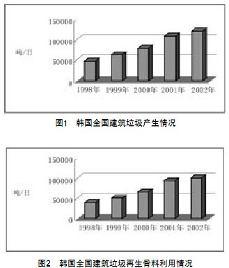 以韓國為(wei)例(li),韓國建(jian)筑(zhu)(zhu)垃(la)圾(ji)產生量(liang)1 9 9 8年(nian)為(wei)47693噸/日(ri),2002年(nian)為(wei)120141噸/日(ri)。建(jian)筑(zhu)(zhu)垃(la)圾(ji)再生骨料占(zhan)建(jian)筑(zhu)(zhu)垃(la)圾(ji)的(de)百分(fen)比1998年(nian)為(wei)76.6%,2002年(nian)為(wei)83.4%,循(xun)環利用的(de)年(nian)平均增(zeng)加(jia)率(lv)為(wei)26.1%(見圖(tu)1和圖(tu)2)。可見韓國建(jian)筑(zhu)(zhu)垃(la)圾(ji)的(de)產生及再生利用量(liang)正(zheng)在逐(zhu)年(nian)增(zeng)加(jia),再生利用率(lv)也(ye)在逐(zhu)年(nian)提高。