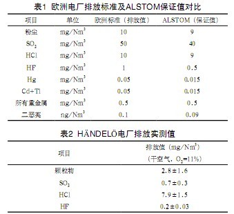 歐洲電廠排放標準及ALSTOM保證值對比見表1,電廠排放實測值見表2。