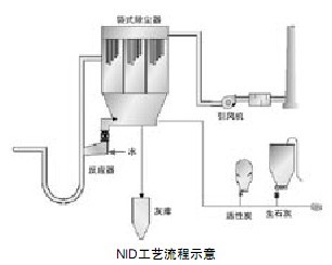 從鍋爐空氣預熱器出來的煙氣溫度約為150℃。若無預除塵器,則煙氣直接經彎曲煙道進入矩形反應器,與均勻混合在增濕循環灰中的吸收劑Ca(OH)2發生反應。在降溫和潮濕的條件下,煙氣中的SO2、SO3、HCl、 HF等與吸收劑在1~1.5s內發生反應,生成亞硫酸鈣、硫酸鈣、氯化鈣和氟化鈣等。隨后,煙氣將反應后的干燥的脫硫循環灰帶入后置的袋式除塵器或電除塵器中,固體物料就從煙氣中分離出來,落入灰斗,由輸送設備輸送至混合器。同時,混合器中不斷加入經消化器消化過的新鮮生石灰。在混合器中,循環物料經增濕、攪拌混合后,含濕率從2%提高到5%左右,在流化和負壓的作用下進入反應器進行再次循環。循環倍率達30~ 150倍。在高的循環倍率下,吸收劑的利用率在95%以上。凈化后的煙氣溫度高出露點10℃~15℃,無須再加熱和防腐,可經引風機直接排入煙囪排放。NID工藝流程見下圖。