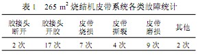 我們對兩臺燒結機皮帶系統故障進行了統計 ,其結果見表 1。從表 1 可看出 ,皮帶膠接頭開膠及皮帶工作面非正常損壞占總故障的 80 % 左右 ,是主要故障點。