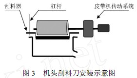 (3)改造皮帶機機頭刮料刀 ,設計了一種對皮帶無傷害的刮料器。該刮料器結構簡單 ,容易制作 ,用普通鋼板和鋼管制作骨架 ,廢舊皮帶制作刮刀 ,使用時將其安裝在皮帶機機頭滾筒中部靠下側 ,使刮刀緊靠在皮帶工作面上 ,如圖 3 所示。用這種刮料器不但能清除皮帶粘料 ,且對膠接頭無傷害 ,可防止皮帶劃傷。
