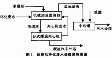 由于環化廢(fei)水水量大,固(gu)含率(lv)較(jiao)低(di),初始條件達不到臥螺(luo)機(ji)的(de)處(chu)理要求,為了提(ti)高(gao)臥螺(luo)機(ji)的(de)工(gong)作效率(lv),改造過程(cheng)考慮先進行機(ji)械沉(chen)降(jiang),同時選用聚酯酰胺作為絮凝劑,提(ti)高(gao)廢(fei)水固(gu)含量,然后再進入臥螺(luo)機(ji)處(chu)理。改造技術流程(cheng)見圖1。