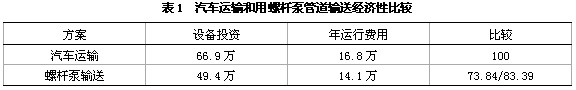 紹興污水處理廠一期工程,用戶曾對汽車運輸和用螺桿泵管道輸送進行過比較(見表1)