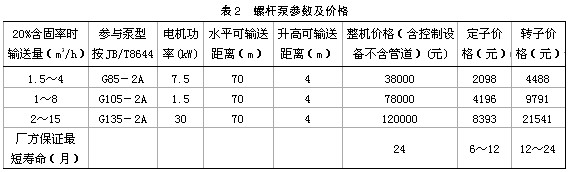 祥符水廠這次改造工程由興龍泵業公司承包,包括原來的無軸螺旋拆除,螺桿泵及管道安裝,控制設備,總費用為96000元,平均每臺48000元,與無軸螺旋費用基本相當。如果輸送距離再進一步增加,無軸螺旋費用是按長度成比例增加的,螺桿泵則只增加管道費用,更顯出優越性。螺桿泵及其備品備件參數及價格如表2