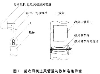 將原焊制的鐵爐布置在除塵器反吹風機進風處,其出口管道和反吹風機進風管道直連。要求鐵爐有效內徑Φ700mm, 出口管道有效內徑Φ250mm( 和反吹風機進風管道內徑相等) , 且在出口管道易操作處設置熱風調節閥和冷風口調節門。方案布置見圖1。在使用中根據濾袋的濕度調整爐火的大小及熱風調節閥和冷風口調節門的大小, 達到預防結露、烘干濾袋的合適的清灰溫度。