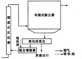 作為吸收劑投入的Ca(OH)2與從除塵器濾下的大量的循環灰相混合進入增濕器,并以流化風力動力借助煙道負壓的引力導入煙道式反應器。大量的脫硫循環灰進入反應器后,反應器中Ca(OH)2的濃度很高,有效鈣酸比很大,且加水消化制得的新鮮Ca(OH)2具有很高的活性,因此能確保較高的脫硫效率。該方法省去了噴霧干燥法復雜的制漿系統,同時循環灰又有極好的流動性,克服了普通半干法反應器中可能出現的粘壁問題。