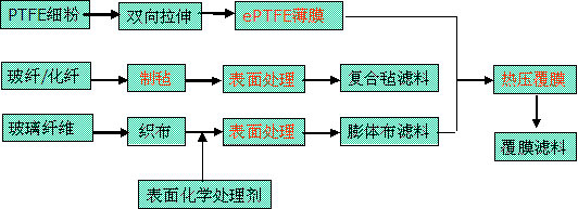 ![]() 圖1 玻璃纖維覆膜濾料的生產工藝流程圖 |