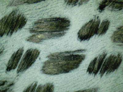 表面處理技術的核心是處理劑配方技術。是以聚四氟乙烯為主,再引入其他組份形成配合料,對玻璃纖維浸漬,在其表面成膜,達到保護纖維的作用。先在玻纖的表面通過化學處理形成了一層富含聚四氟乙烯的表面層,再與聚四氟乙烯濾膜通過高溫高壓融合成一體,形成覆膜濾料,詳見圖3,黑色部份就是膜和布的交織點通過覆膜融成了一體,而其白色部份就是起過濾作用的膜。