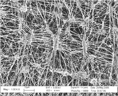 圖5是中材科技股份有限公司公司生產的濾膜的掃描電鏡照片。從圖中可以看出,濾膜的孔徑非常小,在1微米以下,這樣就確保了過濾精度。而目前市場上的覆膜濾料,膜的孔徑都比較大,達幾個微米,甚至更大。