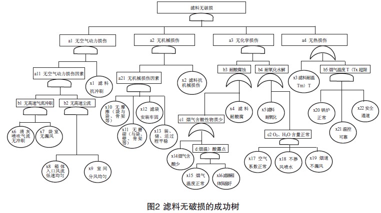 針對袋(dai)(dai)式除塵(chen)器(qi)濾袋(dai)(dai)破(po)損(sun)的(de)故障,結合(he)高井(jing)熱電廠煙氣治理的(de)經驗,做出濾料無破(po)損(sun)的(de)成(cheng)功(gong)樹(如(ru)圖(tu)2所示(shi)),提出防止(zhi)濾袋(dai)(dai)損(sun)傷的(de)技術措施。